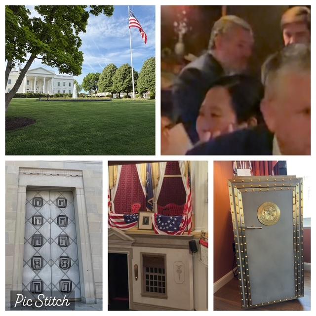 White house lawn once inside the gate, the senator arriving near our table, the strange DOJ dystopian door, the booth where Lincoln was shot, the Riggs hotel bank vault mini fridge. Another pic below...