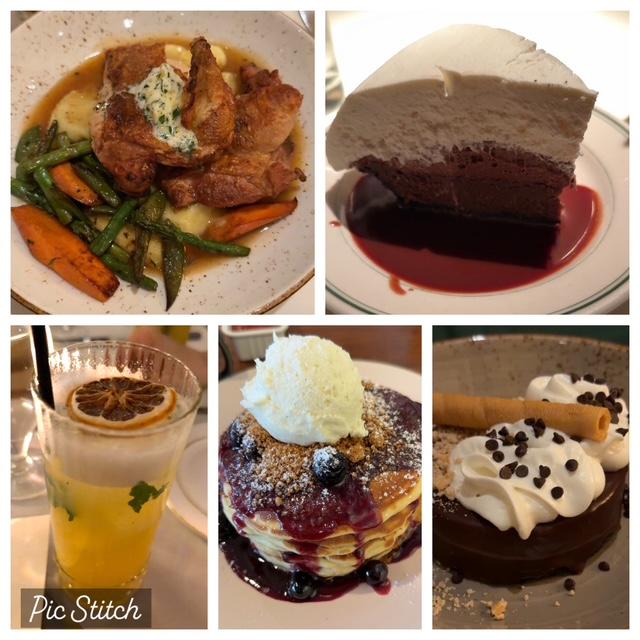 Chicken dish, chocolate pie, a mocktail (pineapple, etc.), blueberry lavendar pancakes, and a chocolate peanut butter dessert.