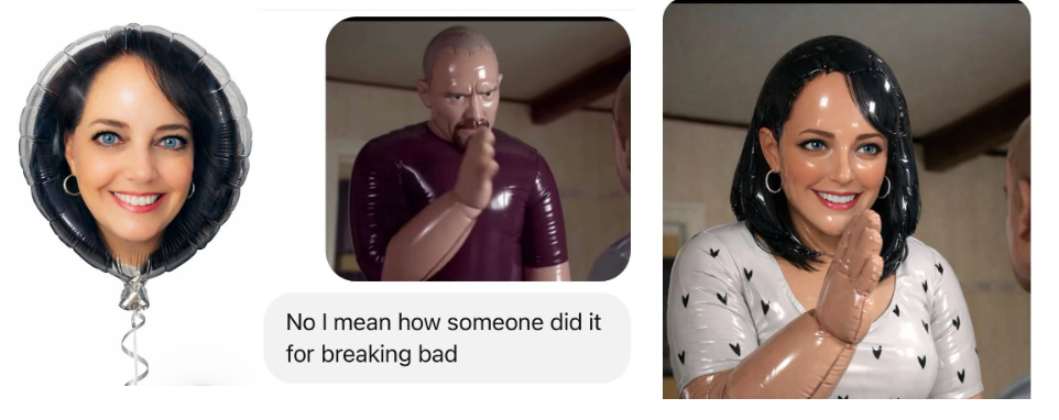 So I first asked it to turn my pic into a helium balloon. When it got it wrong, I showed it the Breaking Bad example. So then it made me a helium balloon, but in the Breaking Bad scene. LOL!Â