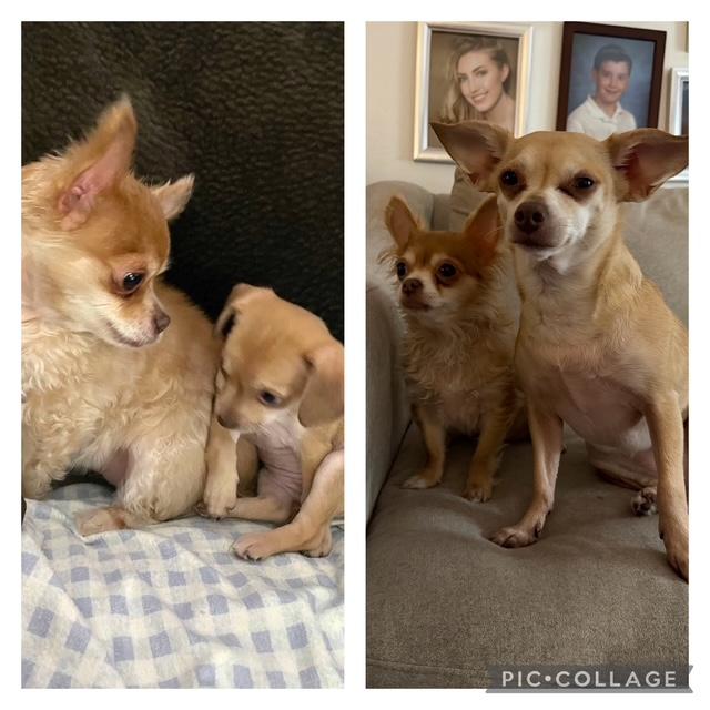 Look at this precious pic. Little Mandy (my tiniest chihuahua) now dwarfs the puppy the brought home a few years ago, but she once towered over her. 💕